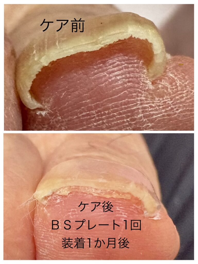 BSプレートを1回装着し、1か月後の評価に伺ってきましたが、綺麗に爪が開いて来ていて痛みもなかったので、オフ施術をさせて頂きました🙏