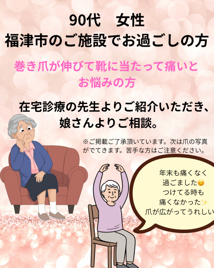 ご施設御入居中 90代の女性の方で、巻き爪が靴に当たって痛いと言うお悩みでした。