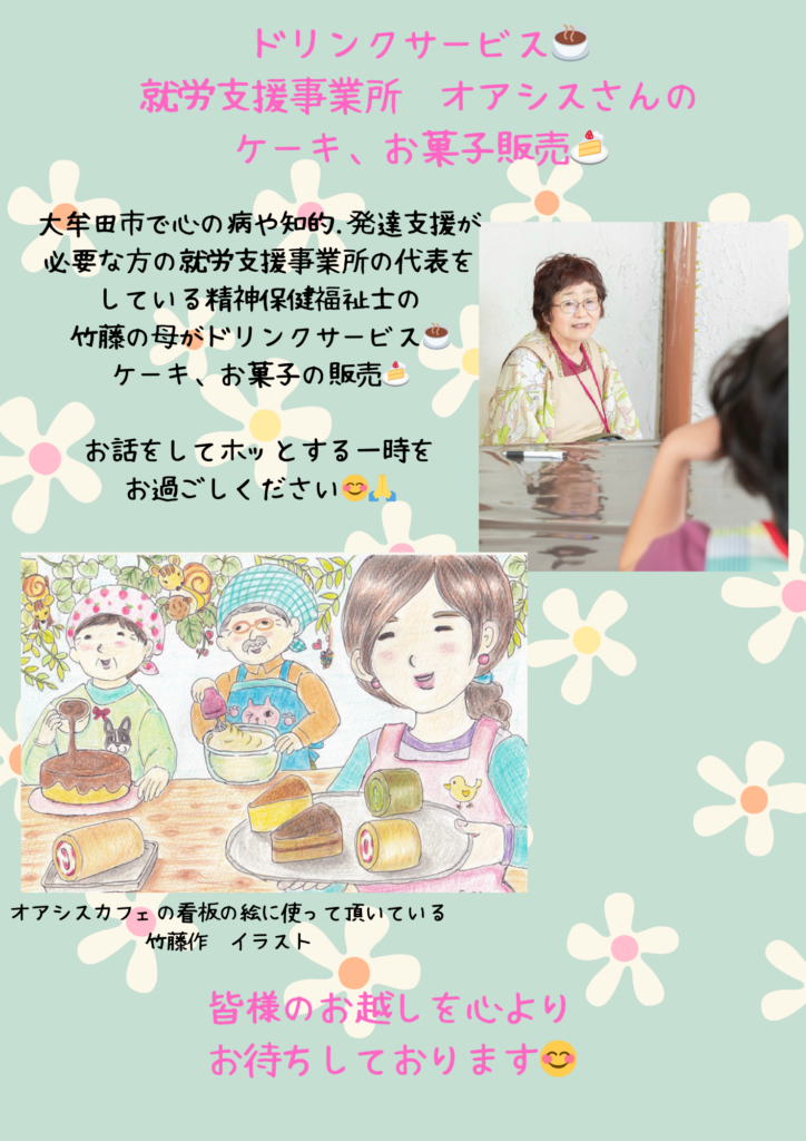 竹藤の母も相談会にあわせて大牟田からスケットに毎回来てくれて、お客様へのドリンクサービス(無料)と、就労支援事業所 オアシスさんのお菓子、ケーキ販売をしています🙏 感謝です😊